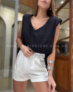 Blusa con strass, escote en v al frente y escote en la espalda, tiene un lazo para atar. Tiene hombreras.