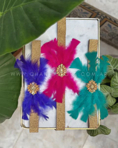 Cintos elsaticos con lurex, con un aplique de olumas y piedras.