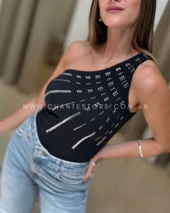 Musculosa de un solo hombro, con apliques de strass de brillos.