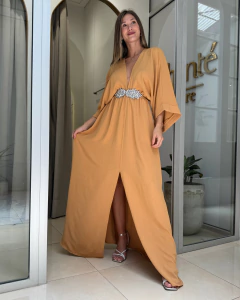 Vestido con mangas, escote v y tajo central. Los accesorios se venden aparte.